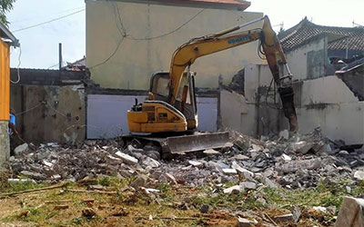 Jasa pembongkaran bangunan menggunakan alat berat yang dilakukan secara profesional, cepat dan aman.